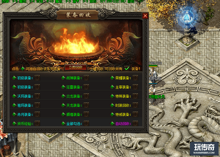 删除智能装备回收列表里的 麻痹戒指 和 复活戒指!不管怪物有没有爆这两样东西,早期这两东西还是非常有用的,万一不小心被回收了就不划算了