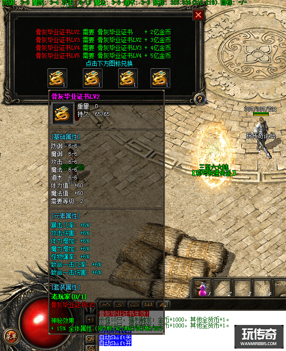 修正盟重 NPC骨灰毕业证书 处 查看装备时,显示弹出游戏主界面UI图片