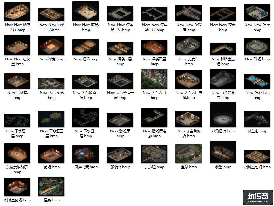 地图为了展示方便,都做了统一大小长方框,实图为大小高低不一的原画。