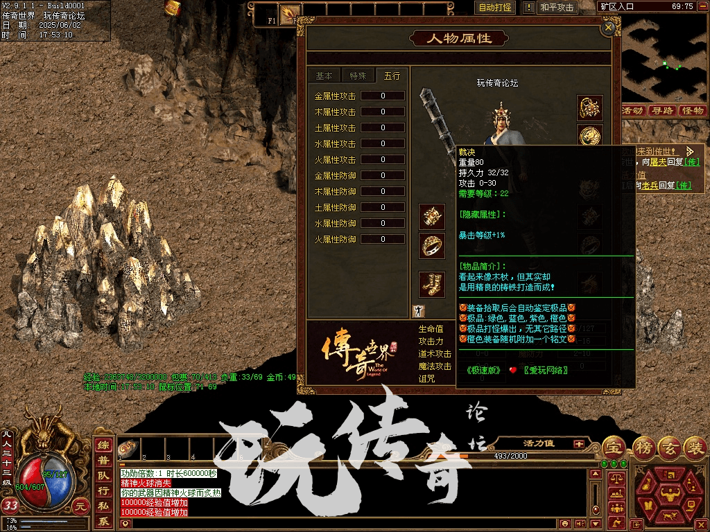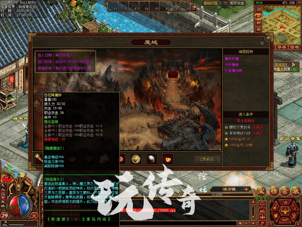 2.新增高级打宝地图。五行空间一、二层和魔域准备场(从碧空城进),五行空间主要用于打boos;魔域准备场主要用于刷材料、金币,内设魔域、暗影迷宫、深渊王座。