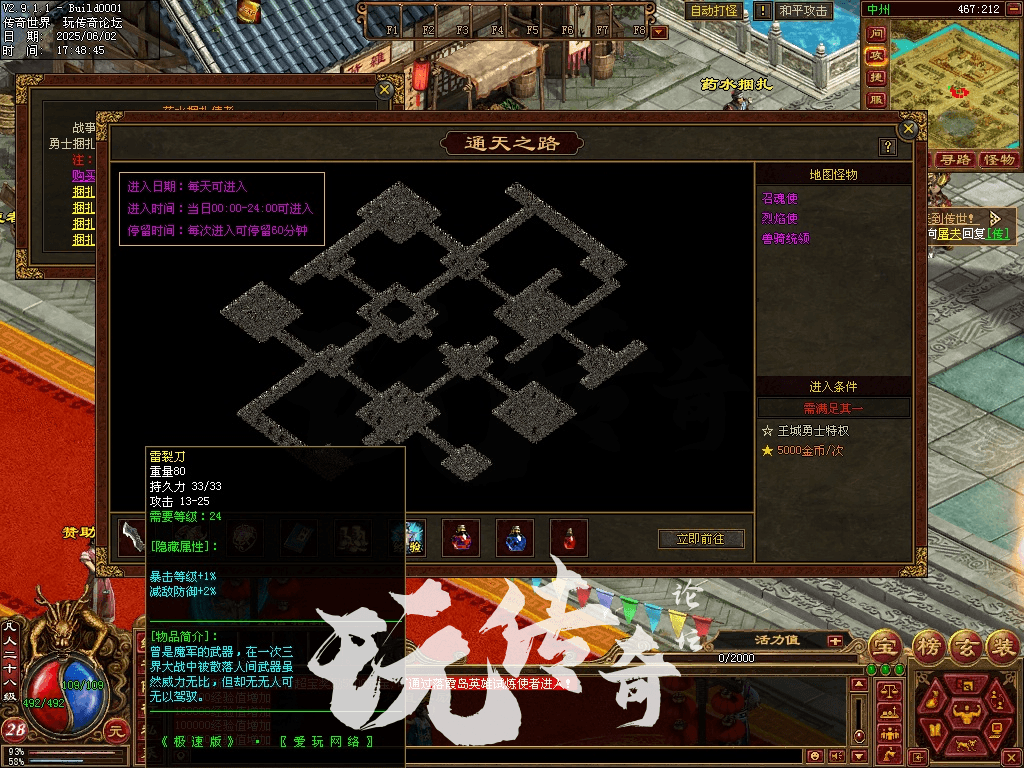 (2)高级打宝地图:从中州或中州广场进入“碧空城”,碧空魔城(各种技能书)、碧空神殿(圣天级装备)、......