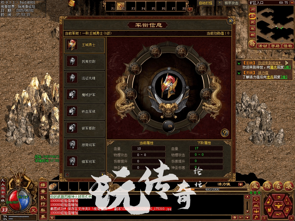(2)军衔:通过打怪或购买封号获得(购买王城勇士封号可以直接升到10级),军衔等级可通过F10右边“军衔入口查看”。