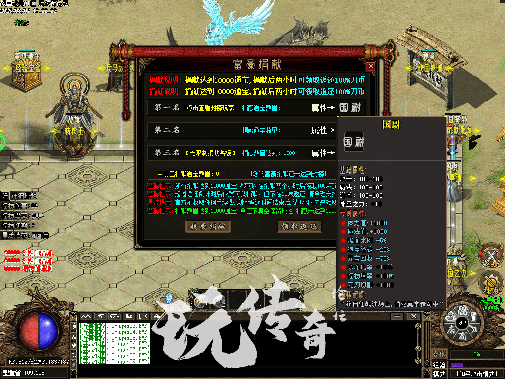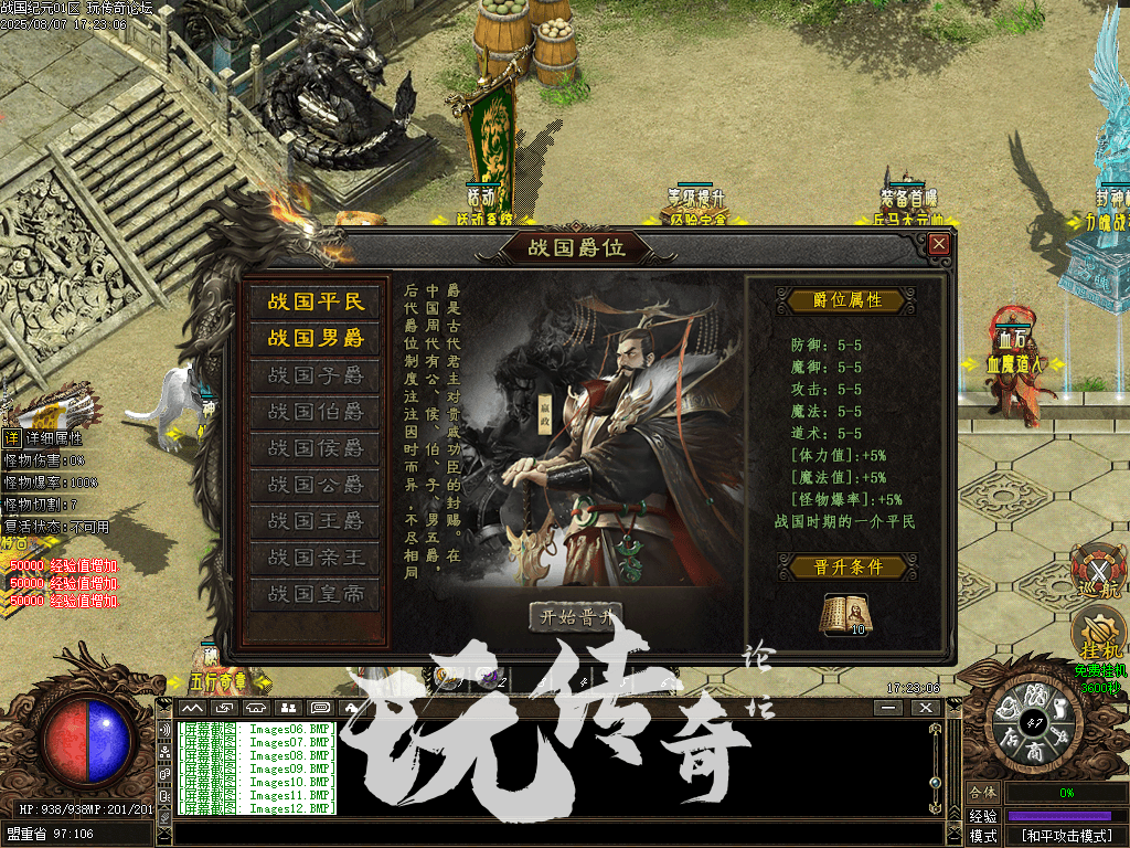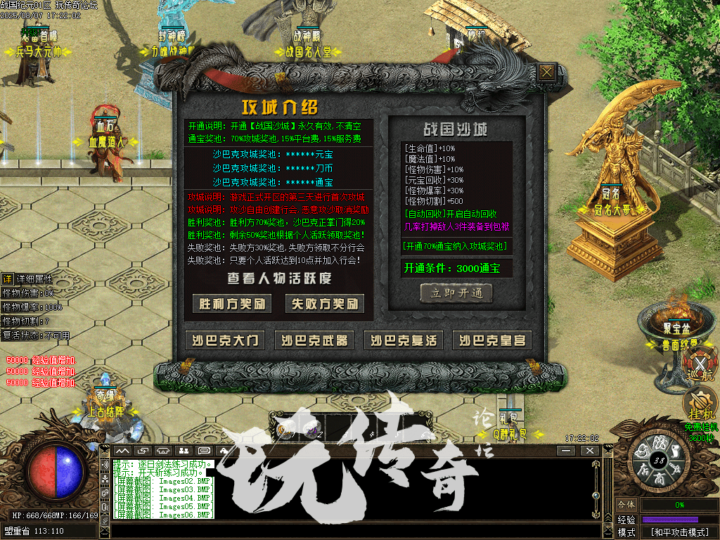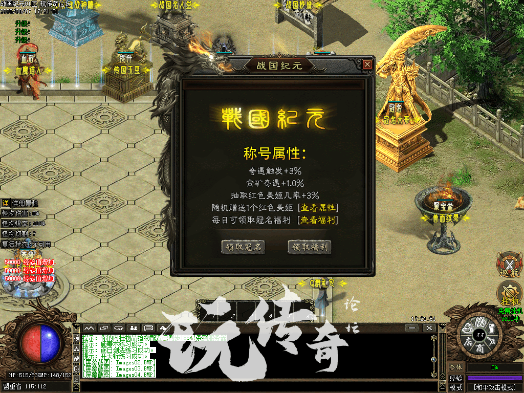战国元处领取冠名称号和冠名福利、开启狂暴沙捐,有条件的可以在土城武器店门口升级武将