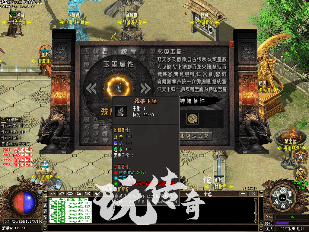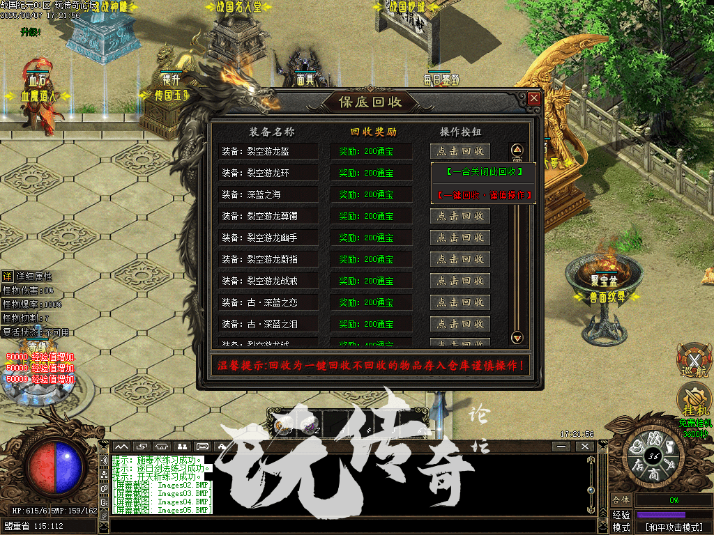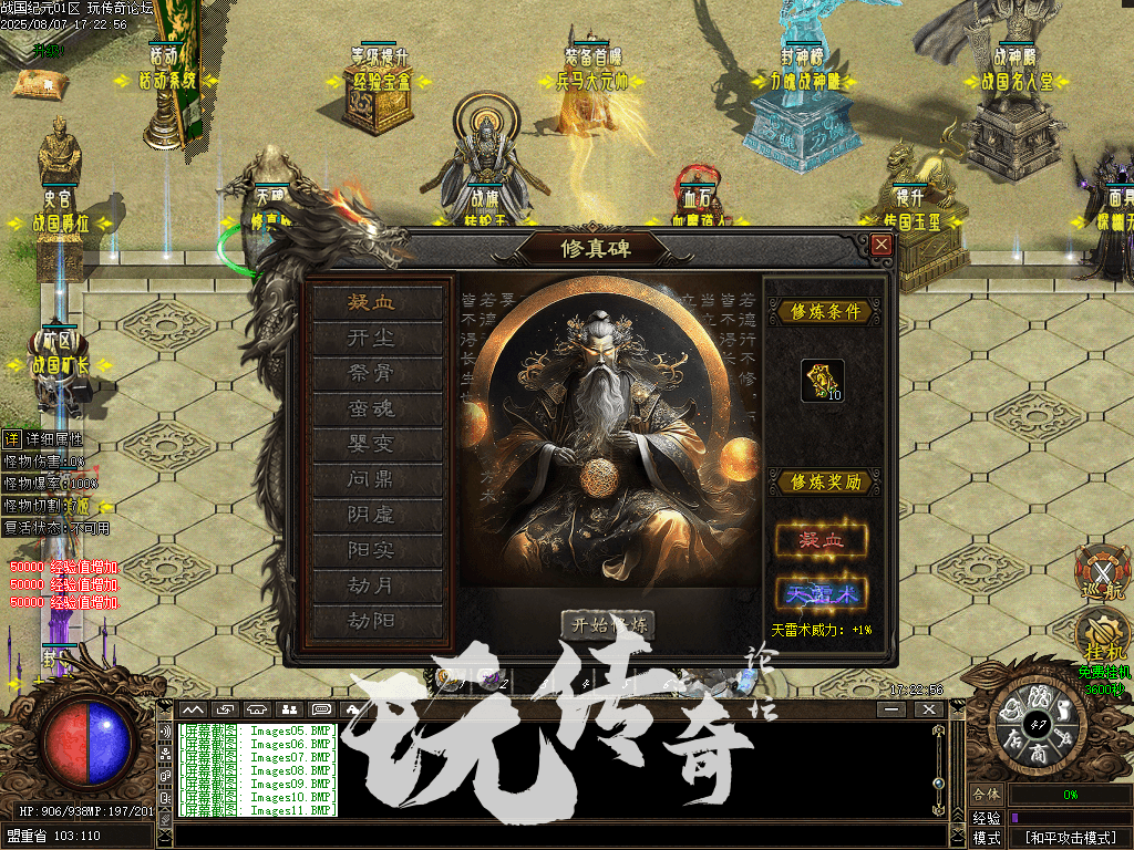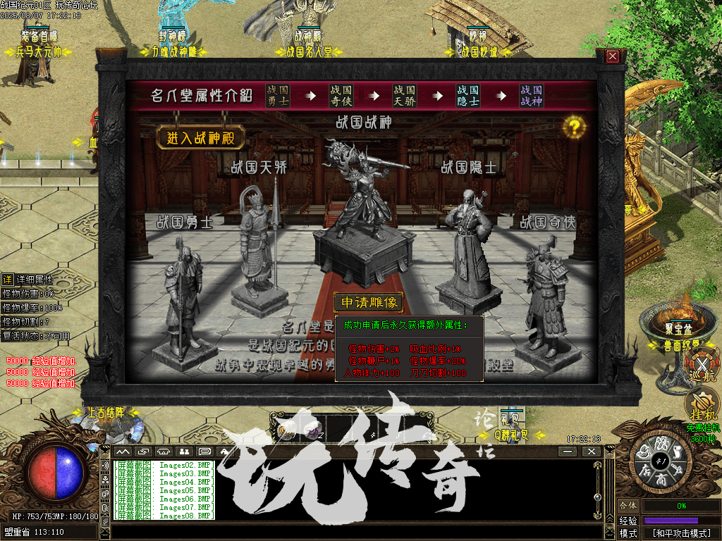 战国元处领取冠名称号和冠名福利、开启狂暴沙捐,有条件的可以在土城武器店门口升级武将
