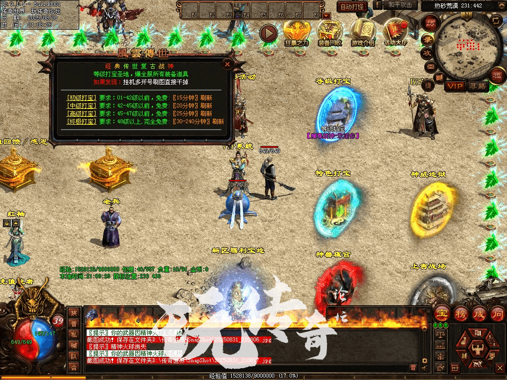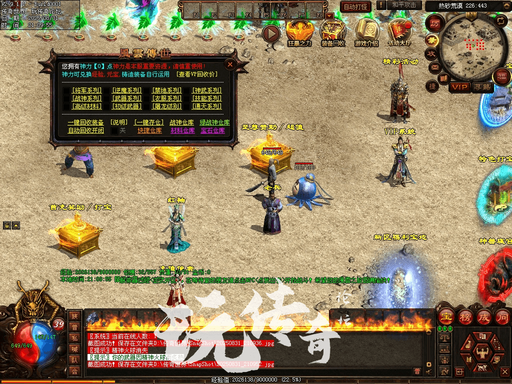进入等级打宝地图,新区福利宝地发育。可爆技能书、基础装备。多余的材料用于回收神力,神力换取经验升级。